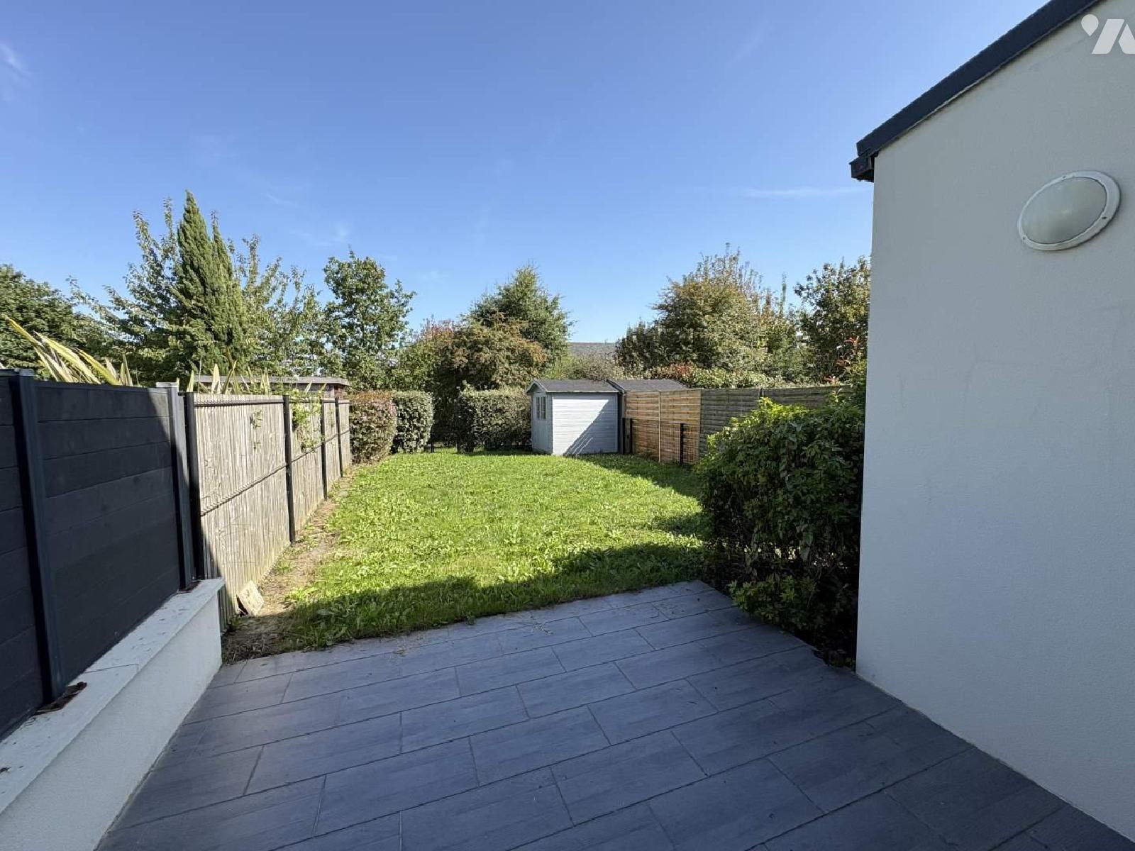 Jardin devant la maison, terrasse et local vélo.